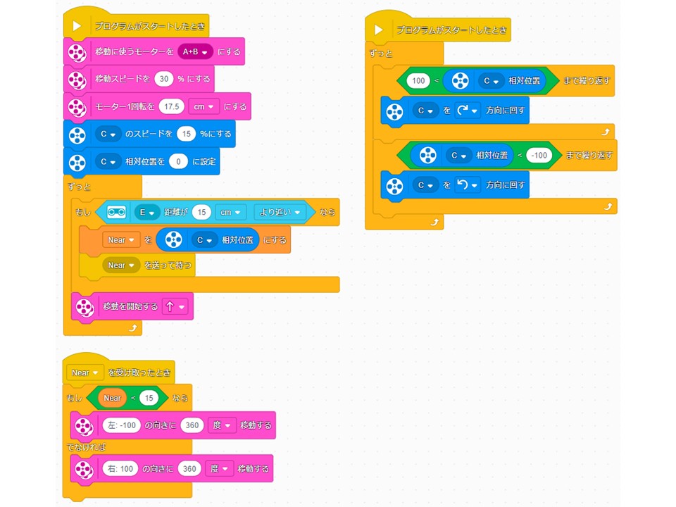 メインブロックでは、移動に使うモーター等の初期設定とEポートにつないだ超音波センサーが15cm以下を検知させるためのループを入れています。検知したら「Near」というメッセージを発信します。