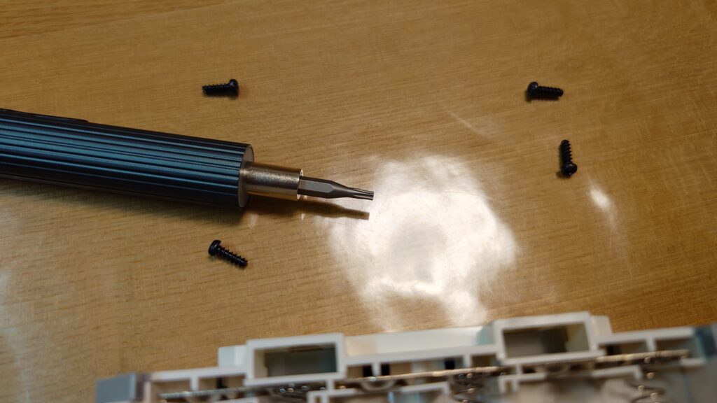 お気に入りの電動精密ドライバーでビスを抜きます。ねじ頭が六芒星みたいな変わったやつです。
